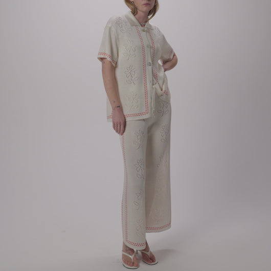 Our Dinner Party Short Sleeve Shirt is inspired by the charm of Italian summers and the motifs found on heritage tablecloths. The top features an intricate pointelle stitch in a custom floral pattern and a dotted intarsia tomato border. Knitted from our signature viscose yarn, this boxy top features a classic pointed collar, and our iridescent shell buttons. Complete the look by pairing them with our Dinner Party Pant for the ultimate vacation ensemble, from beach club to dinner!