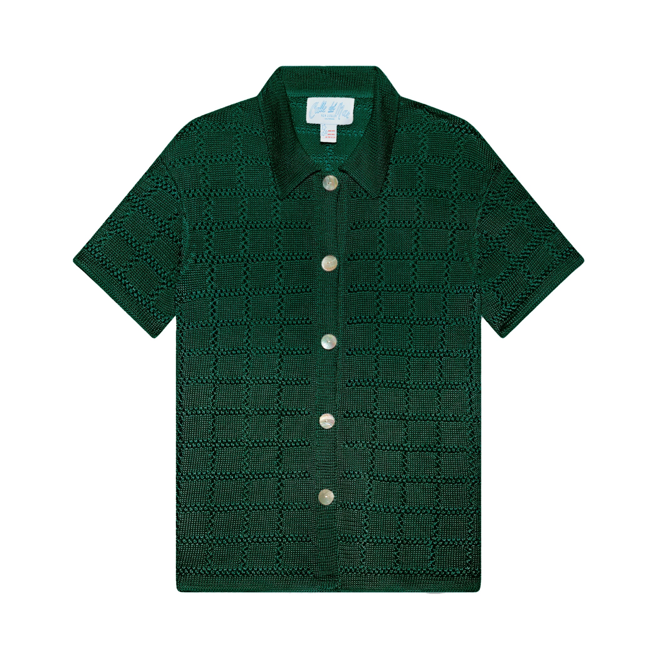 The Garden Party Short Sleeve Shirt evokes a sense of nostalgia, inspired by the delicate motifs found on antique tablecloths and lace. This timeless piece features an intricate pointelle dragonfly pattern, bordered by a dotted intarsia design, adding an heirloom-like touch.
