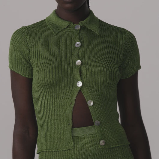 Calle Del Mar's best-selling short sleeve ribbed cardigan is an endlessly versatile piece that you’ll reach for time and time again. Known by our customers as the “ideal first date top", its cool and easy silhouette features a slim, slinky fit, a classic pointed collar & iridescent shell buttons. Wear it slightly undone with a glimpse of skin.