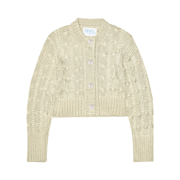 Introducing our Chunky Cable Cardigan, crafted from our signature viscose yarn in a classic cable stitch. Carefully twisted to form a luxurious 4-ply texture, this cardigan boasts a silky, voluminous shape. Complete with our iridescent shell buttons, it's designed with a flattering cropped fit. Elevate your wardrobe with this chic and stylish piece.