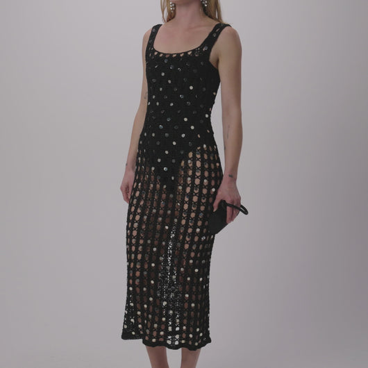 Our embellished crochet dress is the ultimate party dress. Its subtle loose weave pattern is hand crocheted with three ply of our signature viscose yarn by women whose families have been passing this craft down for generations. A craft that has been passed down in founder, Aza's family for generations. Finished with a thick strap & square neckline. This piece is hand embellished with silver paillettes. This sparkly piece makes takes you from From poolside to disco, pair over our one piece for chic day-to-night wear.
