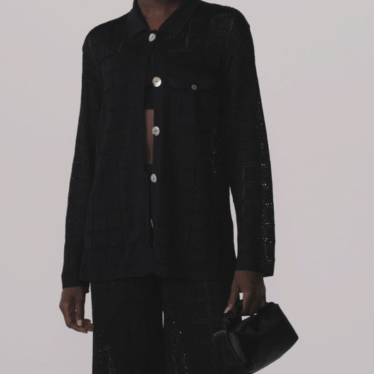 Our best selling long sleeve crochet patchwork shirt is intended for an oversized yet tailored menswear-inspired fit. Complete with a classic pointed collar, buttoned flap pocket, and side slits. Its subtle checkered pattern is knitted in our signature viscose yarn. Throw on with our wide leg patchwork pant for a luxurious, laid-back loungewear style for chic & easy day-to-night wear.