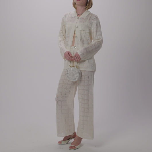 Our best selling long sleeve crochet patchwork shirt is intended for an oversized yet tailored menswear-inspired fit. Complete with a classic pointed collar, buttoned flap pocket, and side slits. Its subtle checkered pattern is knitted in our signature viscose yarn. Throw on with our wide leg patchwork pant for a luxurious, laid-back loungewear style for chic & easy day-to-night wear.