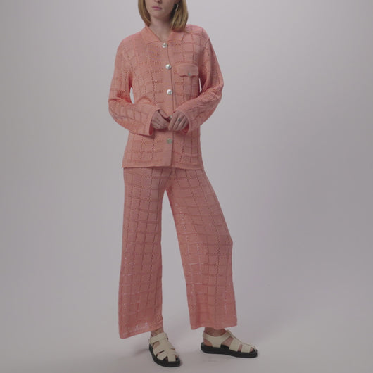 This two-ply pointelle style knit fits true to size, intended for a slightly oversized fit. Complete with a drawstring, elastic waist, and an exaggerated wide draped leg.