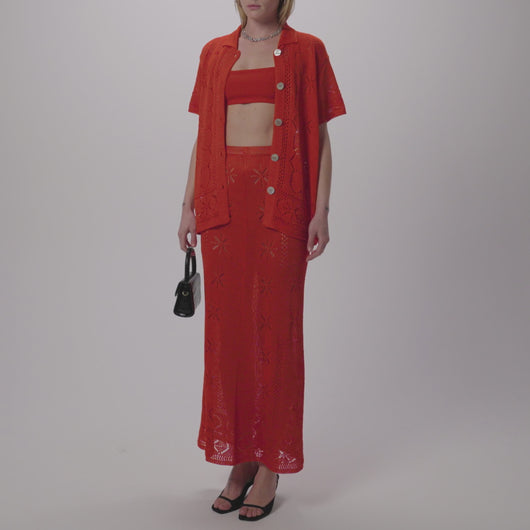 Our pointelle shirt is intended for an oversized menswear-inspired fit. Complete with a classic pointed collar and center front placket, featuring our iridescent shell buttons. Its intricate stitch is knitted in our signature yarn with motifs inspired by heirloom tablecloths from founder Aza's Family, adding a touch of nostalgia and charm. Complete your set with our matching pointelle skirt or pants.