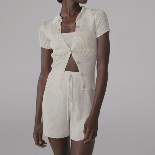 Calle Del Mar's best-selling short sleeve ribbed cardigan is an endlessly versatile piece that you’ll reach for time and time again. Known by our customers as the “ideal first date top", its cool and easy silhouette features a slim, slinky fit, a classic pointed collar & iridescent shell buttons. Wear it slightly undone with a glimpse of skin.