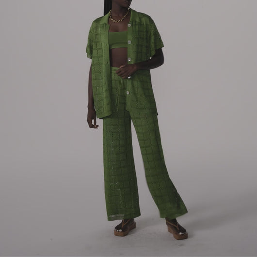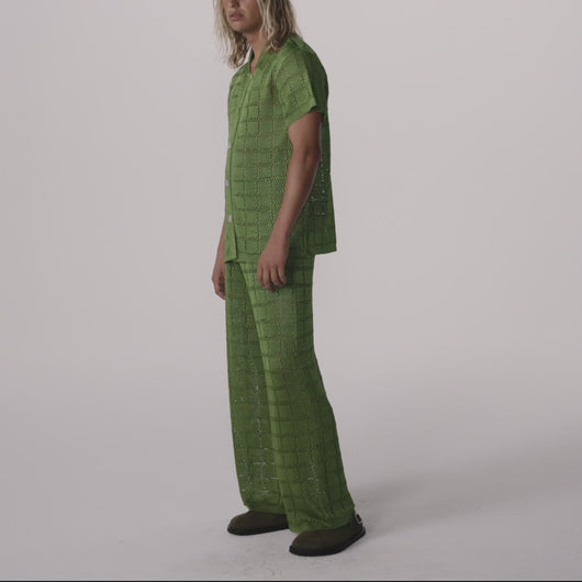 Our crochet patchwork shirt is intended for an oversized menswear-inspired fit. Complete with a classic pointed collar and center front placket, featuring our iridescent shell buttons. Its subtle checkered pattern is knitted in our signature viscose yarn. Throw on with a slouchy pair of jeans for day-to-day wear or over a swim suit for a vacation-ready look.